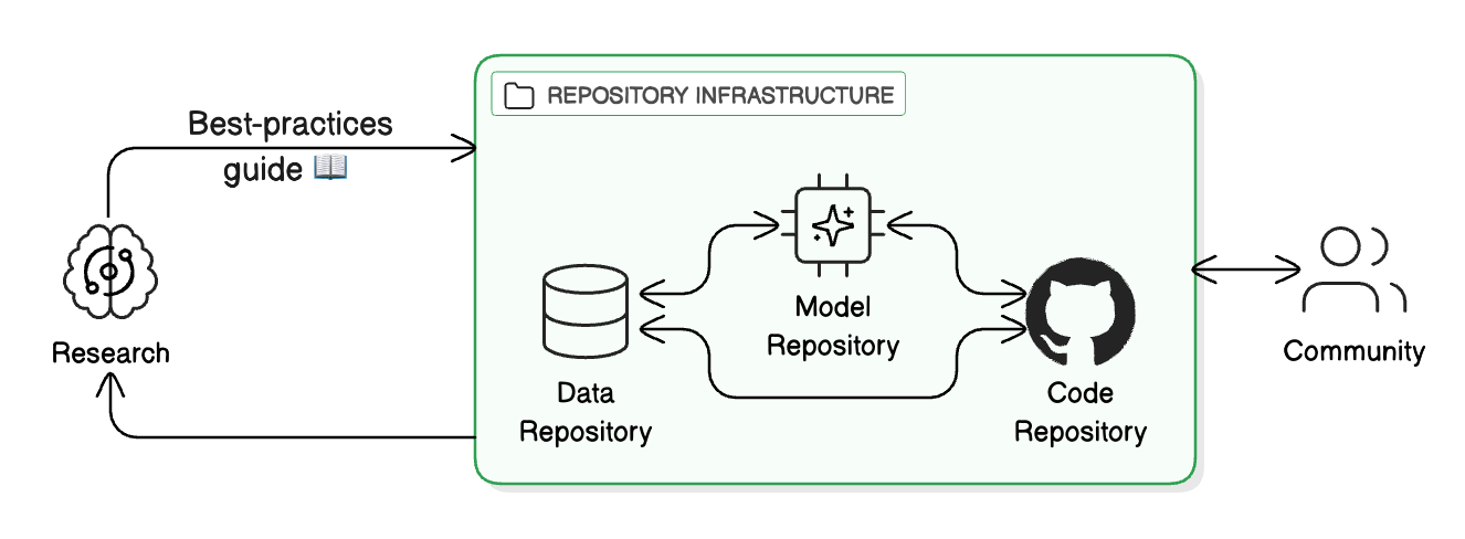 FAIR Guide: Guide to producing FAIR digital products, from metadata collection through product documentation and publication. This builds on the content in both the GitHub and Hugging Face Repository Guides, providing checklists to ensure code, data, and model repositories are FAIR. The latter two closely follow our HF Templates.