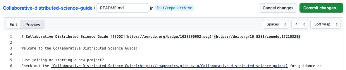 Screenshot of collaborative distributed science guide repo README file header in the GitHub UI with the badge text from above next to the title