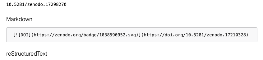 3. Copy the Markdown text and paste it next to your README title. Note that the DOI URL should be the version agnostic DOI (this is the one you will add to your CITATION.cff, as noted in the GitHub Repo Guide)