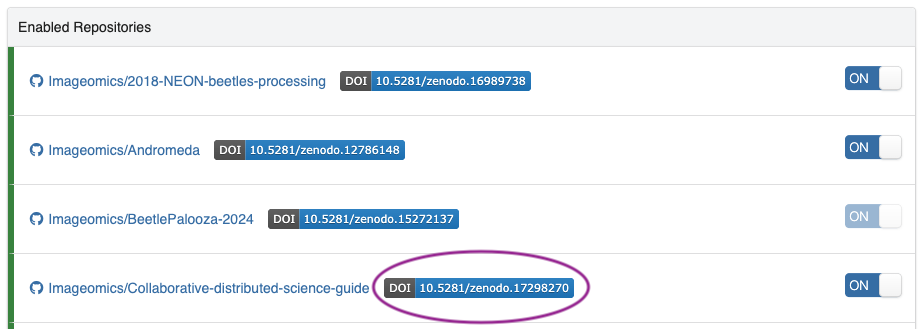 Screenshot of GitHub Integration enabled repos with their DOI badges next to their names, the DOI badge next to the collaborative distributed science guide is circled
