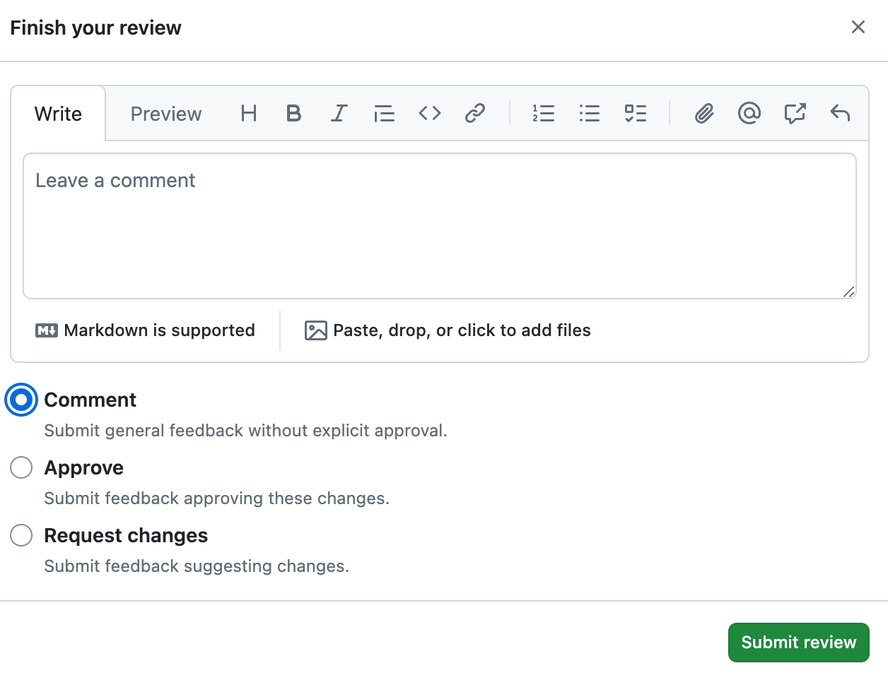 - Select Comment: Provide general feedback on the changes without explicitly approving or rejecting them.